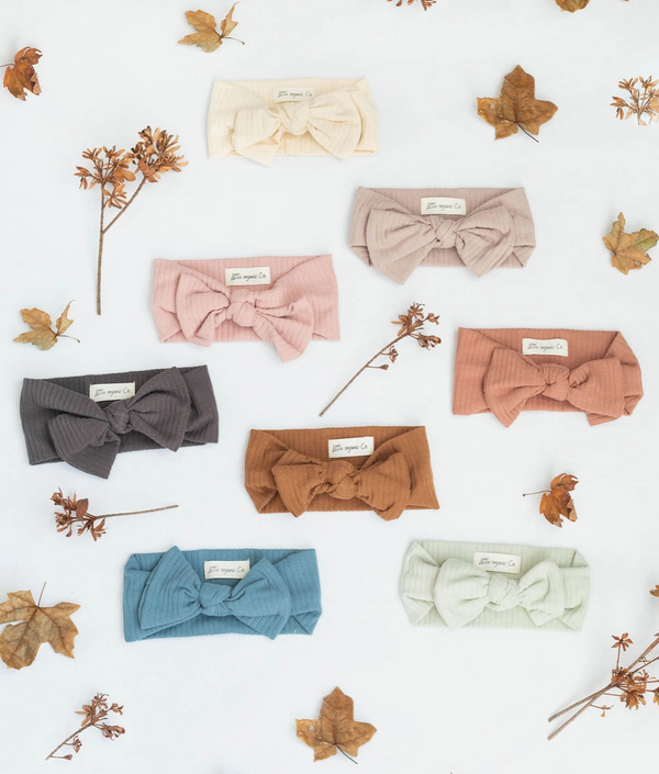Soft and stretchy organic cotton headband Please check out footies, short sleeve , long sleeve bodysuit and hats from the same ribbed collection select from 2 sizes we have newborn - 3 month 3-6 month The tied knot is sewn and not adjustable.