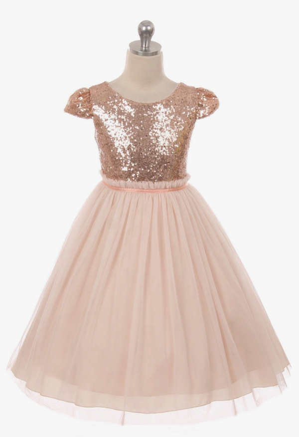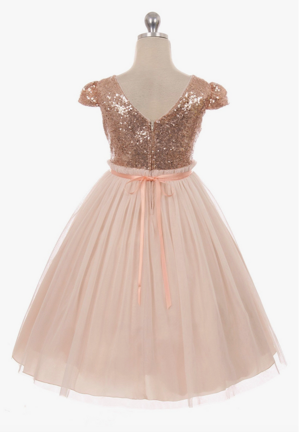Sequin bodice with cap sleeves and mesh trim on neckline. Skirt has layers of soft mesh and is pleated on the waist. Dress is perfect for Flower Girls!